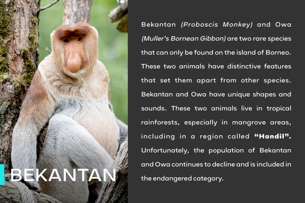 The name “Handil” is derived from a place where two rare and nearly extinct species reside, the Proboscis Monkey (Bekantan) and the Muller’s Bornean Gibbon (Owa). Hearing the word “Handil” reminds us that amidst the bustling world, there are endangered creatures in the remote forests that we must preserve.